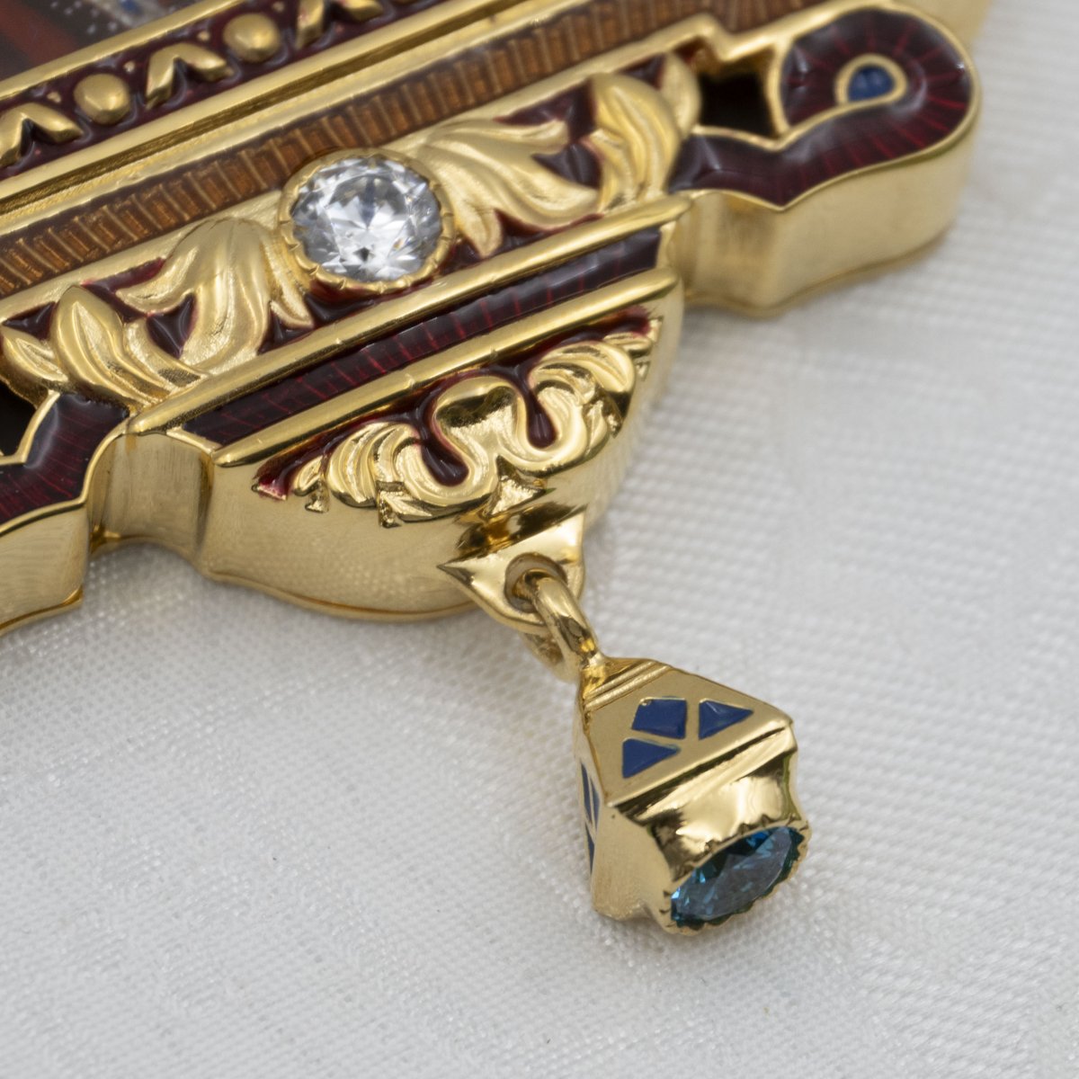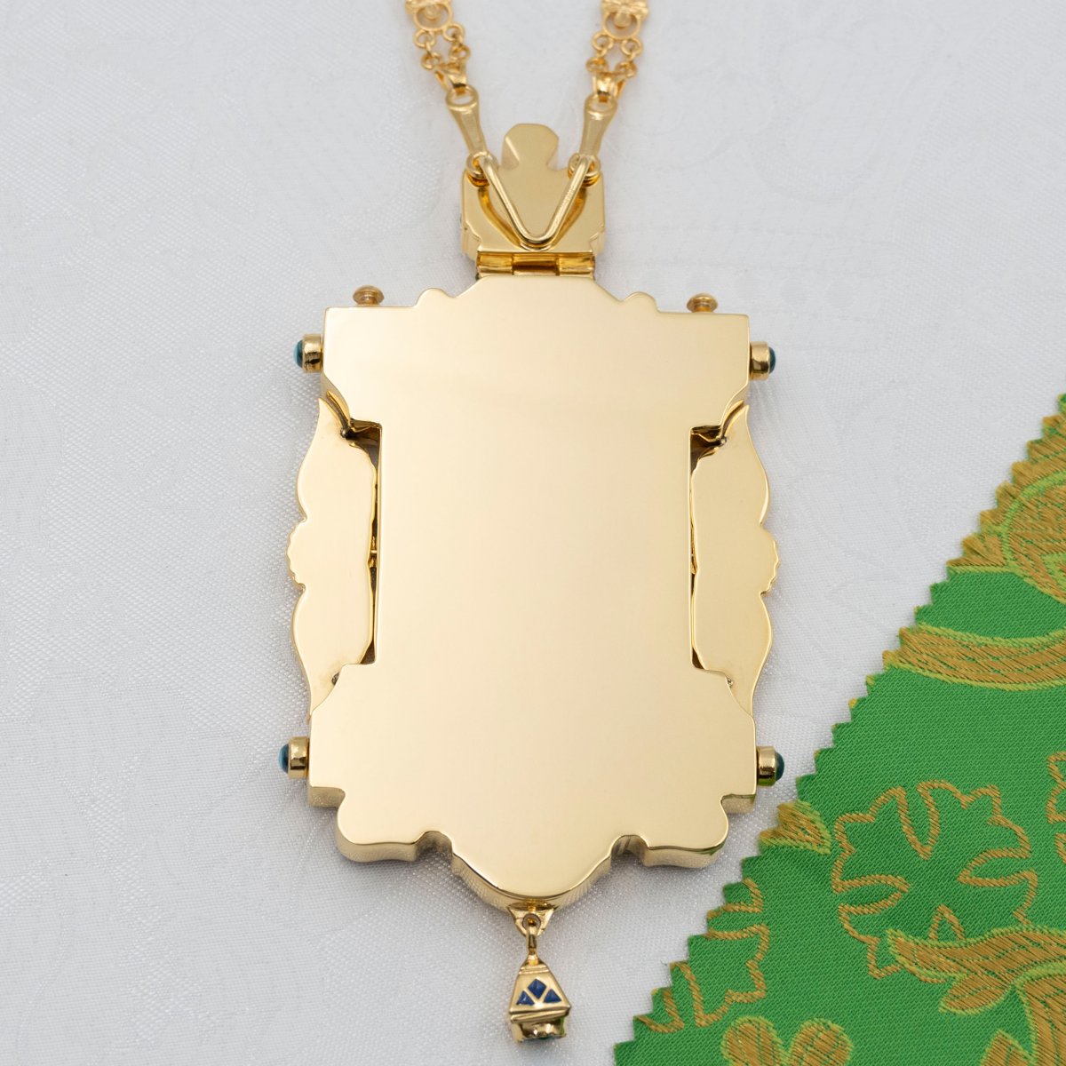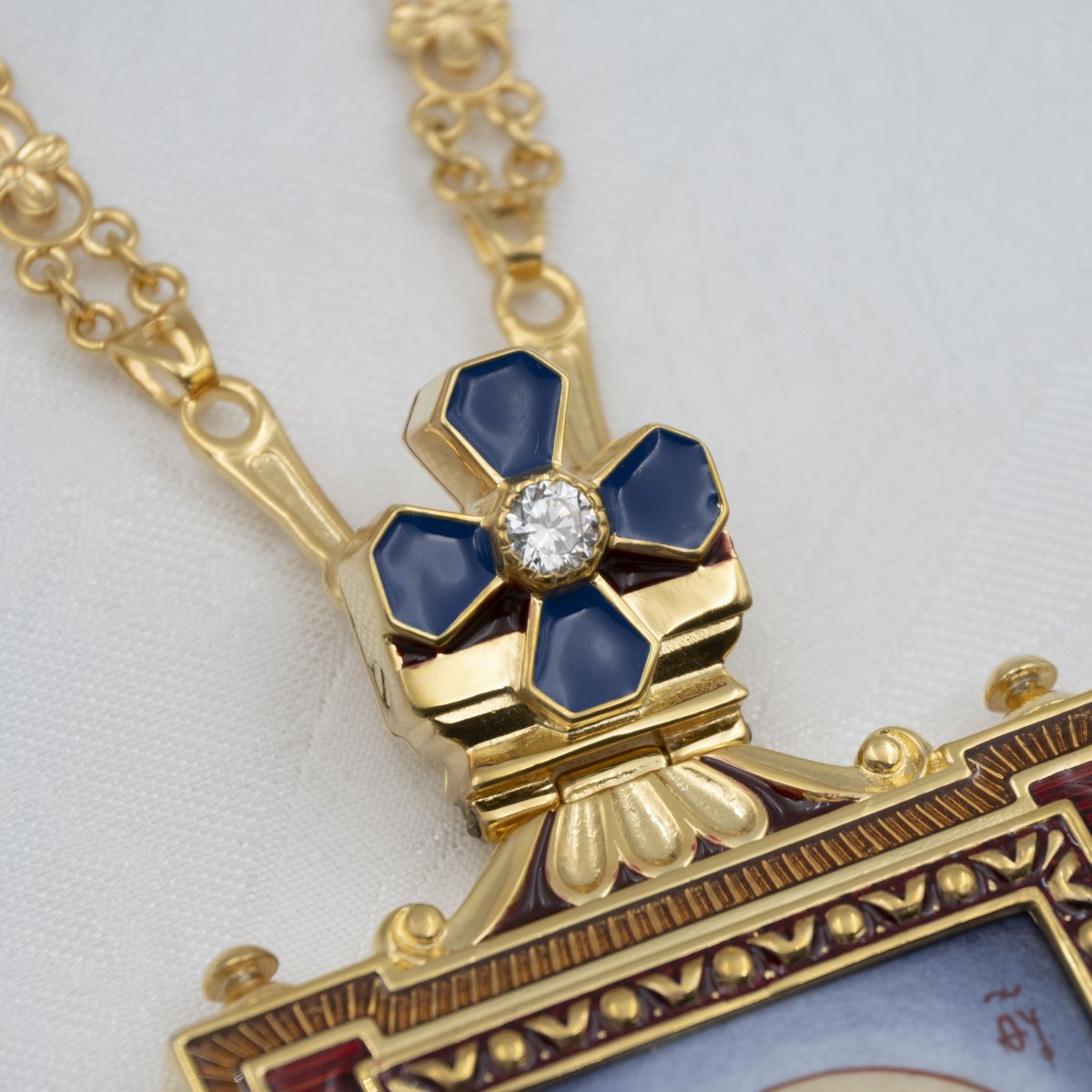 Панагия с цепью изготовлена из высококачественного ювелирного сплава, специально созданного для производства ювелирных изделий. Она покрыта качественной позолотой при помощи гальваники. Нанесенное таким способом покрытие очень надежное и долговечное, благодаря ему первоначальный вид изделия сохранится в неизменном виде на длительный срок. Панагия изготовлена исключительно при помощи ручного труда,и декорирована фианитами и эмалью.Образы выполнены при помощи специальной технологии нанесения цветного изображения на металлическую основу, оно покрыто защитным составом, предохраняющим его от выгорания цвета и повреждений.