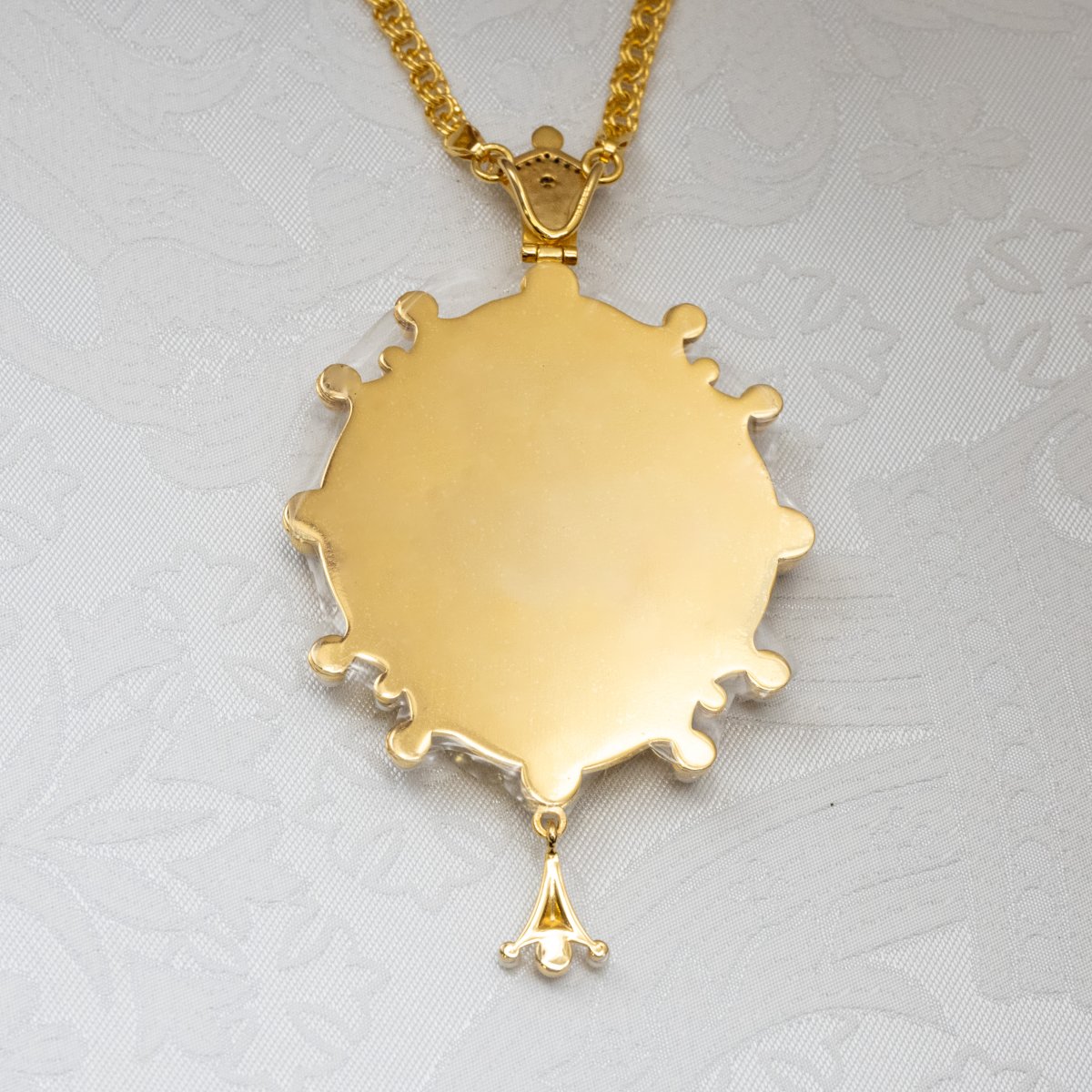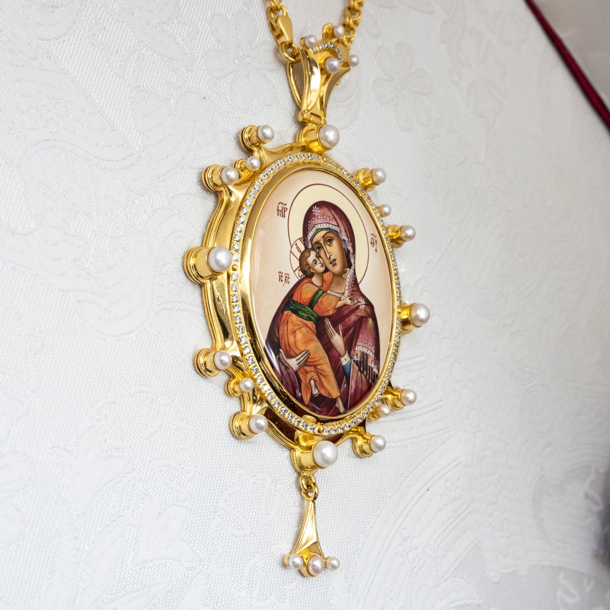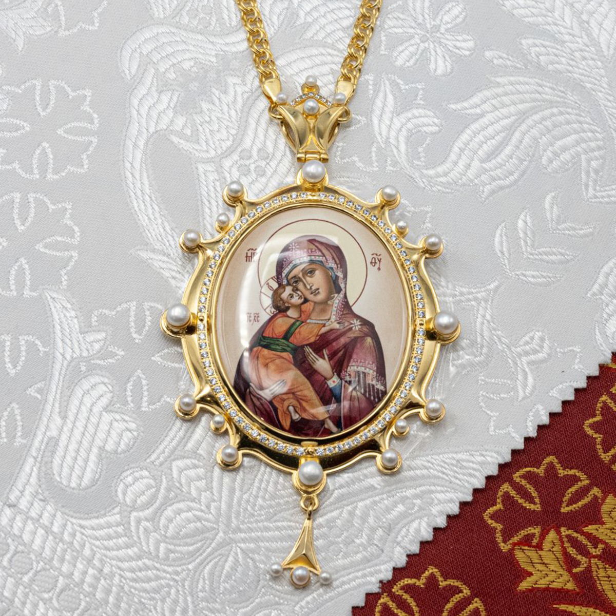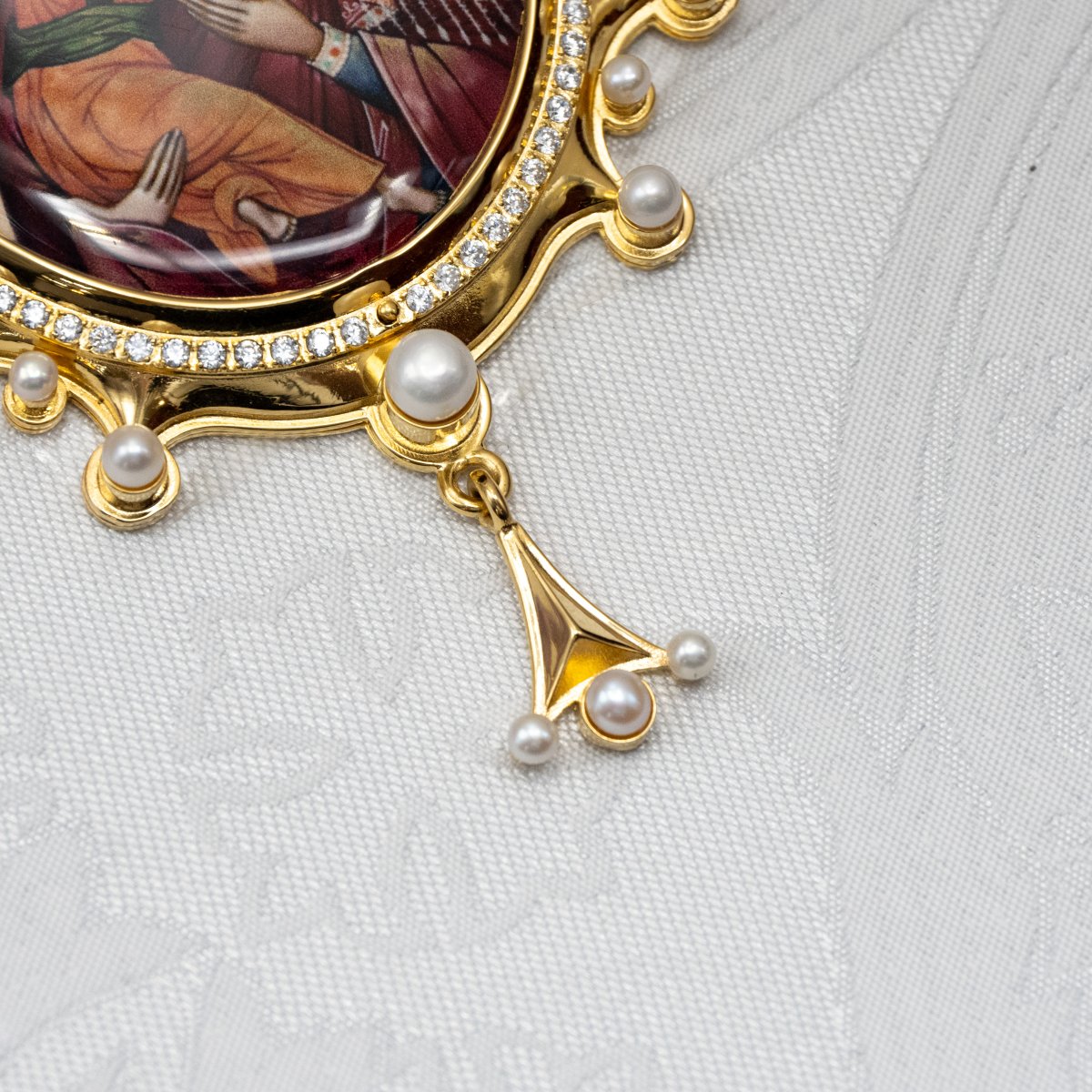 Панагия с цепью изготовлена из высококачественного ювелирного сплава, специально созданного для производства ювелирных изделий. Она покрыта качественной позолотой при помощи гальваники. Нанесенное таким способом покрытие очень надежное и долговечное, благодаря ему первоначальный вид изделия сохранится в неизменном виде на длительный срок. Панагия изготовлена исключительно при помощи ручного труда,и декорирована жемчугом и фианитами. Образ выполнен при помощи специальной технологии нанесения цветного изображения на металлическую основу, оно покрыто защитным составом, предохраняющим его от выгорания цвета и повреждений.