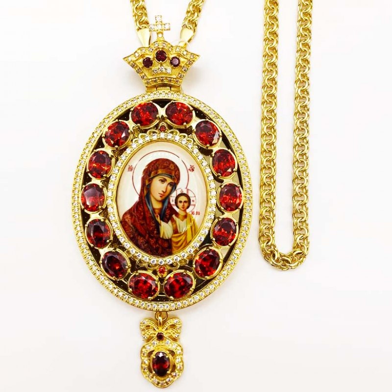 Архиерейская панагия изготовлена из высококачественного ювелирного сплава с применением исключительно ручного труда. Образ Богородицы выполнен по специальной технологии нанесения цветного изображения на металлическую основу. Он покрыт защитным составом, который предохраняет его от выгорания цвета и различных повреждений, по вашему заказу икона на панагии может быть любой. Панагия покрыта надежной и долговечной позолотой при помощи гальваники, за ней очень просто ухаживать. Панагия в комплекте с цепью, продается в презентабельной упаковке из кожвинила с бархатным ложементом.