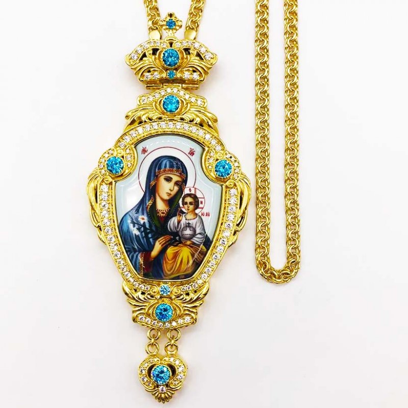 Архиерейская панагия изготовлена из высококачественного ювелирного сплава с применением исключительно ручного труда. Образ Богородицы выполнен по специальной технологии нанесения цветного изображения на металлическую основу. Он покрыт защитным составом, который предохраняет его от выгорания цвета и различных повреждений, по вашему заказу икона на панагии может быть любой. Панагия покрыта надежной и долговечной позолотой при помощи гальваники, за ней очень просто ухаживать. Панагия в комлекте с цепью, продается в презентабельной упаковке из кожвинила с бархатным ложементом.