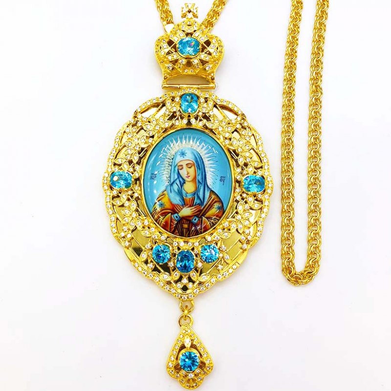 Архиерейская панагия оригинального дизайна изготовлена из ювелирного сплава и покрыта Золотом при помощи технологии гальваники. Образ выполнен по специальной технологии нанесения цветного изображения на металлическую основу и покрыт специальным составом, предохраняющим его от повреждений и воздействия света. Панагия в комплекте с цепью, продается в презентабельной кожвиниловой упаковке с бархатным ложементом
