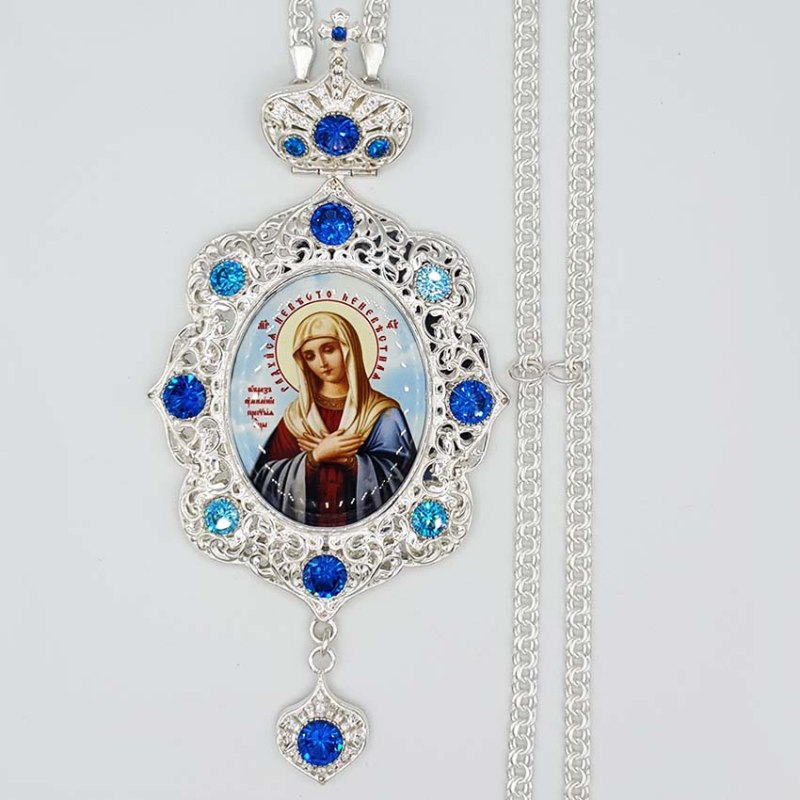 Архиерейская панагия изготовлена из высококачественного ювелирного сплава с применением исключительно ручного труда. Образ Богородицы «Умиление» выполнен по специальной технологии нанесения цветного изображения на металлическую основу. По вашему заказу икона на панагии может быть любой. Панагия покрыта надежным и долговечным серебрением при помощи гальваники, за ней очень просто ухаживать. Чтобы вернуть изделию первоначальный блеск – достаточно просто протереть его мягкой сухой тканью и хранить его без доступа влаги. Орнамент лицевой стороны панагии выполнен в виде сплетения стилизованного растительного орнамента на просвет, сквозь него видна оборотная сторона панагии, отполированная до зеркального блеска. Декор украшен вставками камней кубического циркония (фианиты). Изделие продается в презентабельной упаковке из кожвинила с бархатным ложементом.