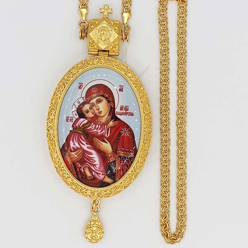 Архиерейская панагия изготовлена из высококачественного ювелирного сплава с применением исключительно ручного труда. Образ Богородицы «Владимирская» выполнен по специальной технологии нанесения цветного изображения на металлическую основу. По вашему заказу икона на панагии может быть любой. Панагия покрыта надежной и долговечной позолотой при помощи гальваники, за ней очень просто ухаживать. Чтобы вернуть изделию первоначальный блеск – достаточно просто протереть его мягкой сухой тканью и хранить его без доступа влаги. Лаконичный орнамент лицевой стороны панагии выполнен в виде сплетения стилизованного растительного орнамента. Благодаря тому, что размер у панагии средний и нет камней, такая панагия может быть отличный вариантом кабинетной панагии. Изделие продается в презентабельной упаковке из кожвинила с бархатным ложементом.