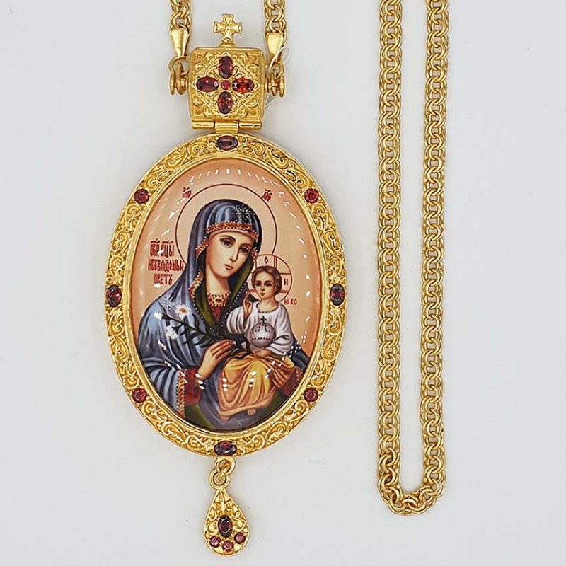Архиерейская панагия изготовлена из высококачественного ювелирного сплава с применением исключительно ручного труда. Образ Богородицы «Неувядаемый Цвет» выполнен по специальной технологии нанесения цветного изображения на металлическую основу. По вашему заказу икона на панагии может быть любой. Панагия покрыта надежной и долговечной позолотой при помощи гальваники, за ней очень просто ухаживать. Чтобы вернуть изделию первоначальный блеск – достаточно просто протереть его мягкой сухой тканью и хранить его без доступа влаги. Лаконичный орнамент лицевой стороны панагии выполнен в виде сплетения стилизованного растительного орнамента и украшен вставками камней кубического циркония (фианиты). Изделие продается в презентабельной упаковке из кожвинила с бархатным ложементом.