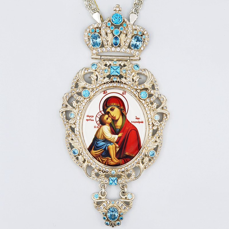 рхиерейская панагия изготовлена из ювелирного сплава особого качества, специально созданного для производства ювелирных изделий. Серебрение нанесена\о при помощи гальваники. Такая передовая технология позволяет наносить очень надежное и долговечное покрытие. Панагия и цепь изготовлены при помощи исключительно ручного труда. Образ выполнен по специальной технологии нанесения цветного изображения на металлическую основу и покрыт защитным составом от выгорания цвета и повреждений. По вашему заказу образ на панагии может быть любым. Лицевая сторона панагии декорирована вставками качественных камней кубического циркония (фианиты). Изделие продается в презентабельной кожвиниловой упаковке с бархатным ложементом.