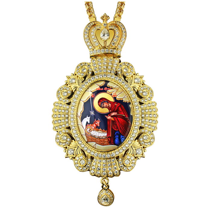 Архиерейская панагия изготовлена из латуни и покрыта качественной поЗолотой, нанесенной гальваническим способом. Такая технология обеспечивает неизменный вид изделия на очень долгое время. Образ выполнен по специальной технологии нанесения цветного изображения на латунную основу и покрыт составом, предохраняющим его от механических повреждений и воздействия света. По заказу образ может быть любым. Икону обрамляет литьевой, объемный, золоченый декор с россыпью качественных камней-Фианитов. Все камни закреплены вручную, что гарантирует их постоянное нахождение на своих местах. Изделие реализуется в презентабельной кожвиниловой упаковке с бархатным ложементом.