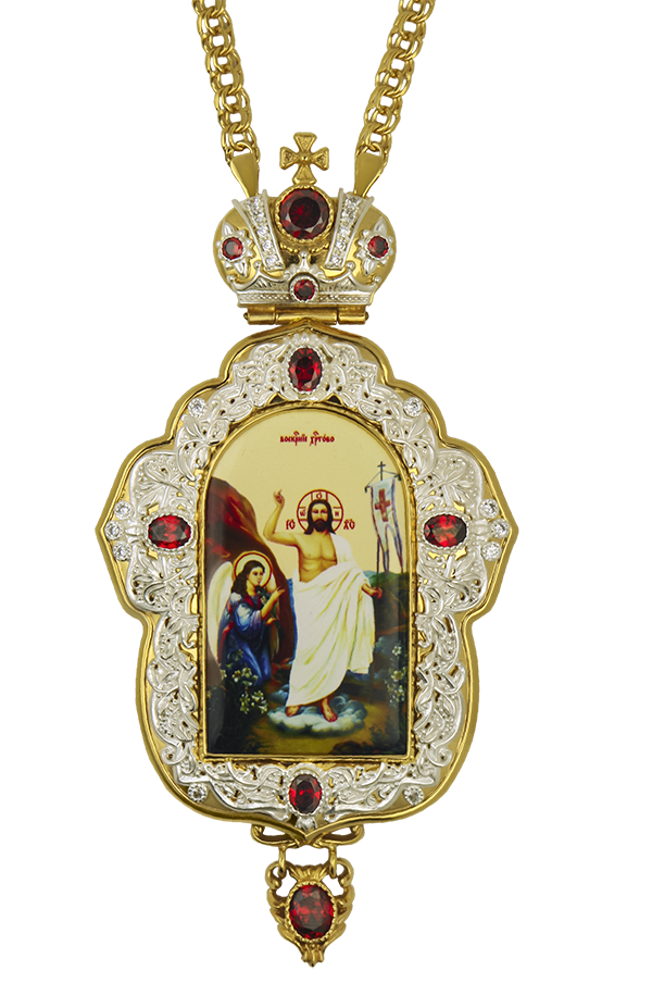 Архиерейская панагия среднего размера необычной формы изготовлена из ювелирного сплава и покрыта Золотом 999,9 пробы, нанесенным гальваническим способом. Образ выполнен по специальной технологии нанесения цветного изображения на металлическую основу и покрыт защитным составом, предохраняющим его от выгорания цвета и повреждений. По вашему заказу образ на панагии может быть любым. Лицевая сторона панагии декорирована вставками камней-Фианитов и фрагментарным серебрением. Подвеска прикреплена при помощи парных колец, благодаря чему она не будет заворачиваться, когда священнику нужно будет поднять руку для крестного знамения или благословения верующих. К этой панагии есть крест, артикул 2.10.0235лп-21лп. Изделие продается в презентабельной кожвиниловой упаковке с бархатным ложементом.