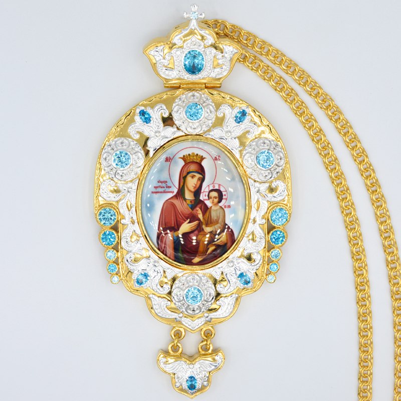 Архиерейская панагия изготовлена из ювелирного сплава особого качества, специально созданного для производства ювелирных изделий. Позолота и радирование нанесены при помощи гальваники. Такая передовая технология позволяет наносить очень надежное и долговечное покрытие. Панагия и цепь изготовлены при помощи исключительно ручного труда. Образ Богородицы выполнен по специальной технологии нанесения цветного изображения на металлическую основу и покрыт защитным составом от выгорания цвета и повреждений. По вашему заказу образ на панагии может быть любым. Лицевая сторона паанагии декорирована вставками качественных камней-Фианитов и акцентирована радированием. Изделие продается в презентабельной кожвиниловой упаковке с бархатным ложементом.