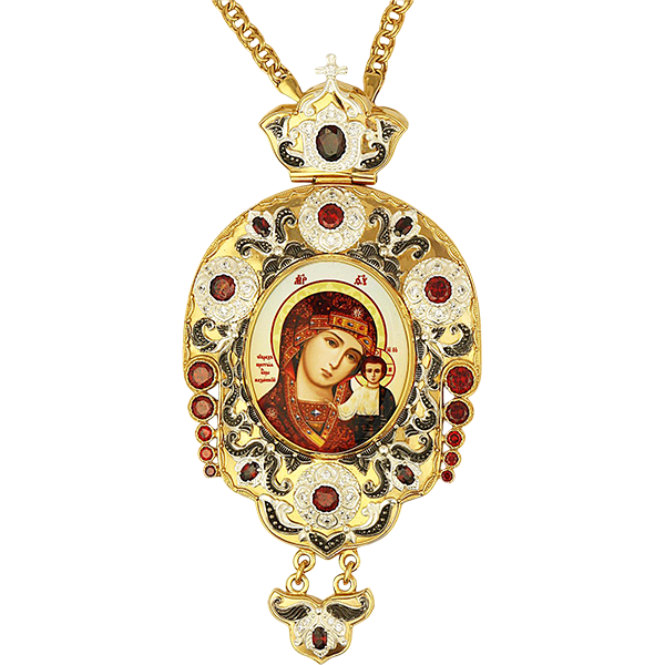 Архиерейская панагия изготовлена из ювелирного сплава особого качества, специально созданного для производства ювелирных изделий. Позолота и радирование нанесены при помощи гальваники. Такая передовая технология позволяет наносить очень надежное и долговечное покрытие. Панагия и цепь изготовлены при помощи исключительно ручного труда. Образ Богородицы выполнен по специальной технологии нанесения цветного изображения на металлическую основу и покрыт защитным составом от выгорания цвета и повреждений. По вашему заказу образ на панагии может быть любым. Лицевая сторона панагии декорирована вставками качественных камней-фианитов и акцентирована радированием. Изделие продается в презентабельной кожвиниловой упаковке с бархатным ложементом.
