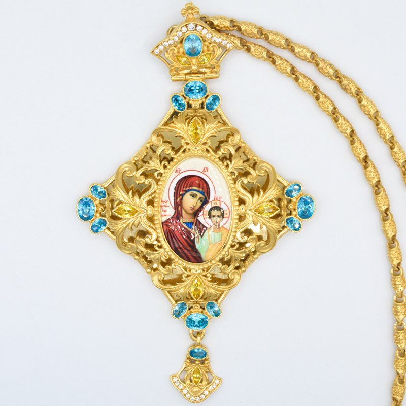 Небольшая архиерейская панагия с образом Богородицы «Казанская» изготовлена из ювелирного сплава, специального созданного для производства ювелирных изделий. Она покрыта качественной и надежной позолотой, нанесенной при помощи передовой технологии – гальваника. Такое покрытие длительный срок сохраняет совой первоначальный вид, за ним просто ухаживать. Икона Богородицы, которая по вашему заказу может быть любой, выполнена при помощи специальной технологии нанесения цветного изображения на металлическую основу, она покрыта составом, предохраняющим ее от выгорания цвета и повреждений. Лицевая сторона панагии объемная, выполнена на просвет, сквозь нее видна отполированная до зеркального блеска задняя стенка панагии, которая блестит, при попадании на нее лучей света. В декоре панагии использованы вставки камней кубического циркония, а благодаря своим размерам - такая панагия может быть отличным вариантом кабинетной панагии, или панагии для частого использования. По желанию заказчика эта панагия может быть изготовлена с любым образом. Изделие продается в презентабельной кожвиниловой упаковке с бархатным ложементом.