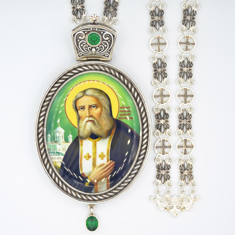 Панагия среднего размера изготовлена из высококачественного ювелирного сплава и покрыта надежным и долговечным серебрением (серебро 999,9 пробы). Он покрыт составом, предохраняющим его от выгорания цвета и повреждений. По вашему заказу образ на панагии может быть любым. Орнамент, окружающий икону и украшающий корону покрыт чернением, благодаря чему внешний первоначальный вид изделия останется неизменным. Корона и подвеска украшены вставками качественных камней кубического циркония (фианиты). Панагия изготовлена при помощи исключительно ручного труда  и продается в презентабельной подарочной упаковке из кожвинила с бархатным ложементом, стоимость которой в ходит в цену, указанную на сайте. Цепь ручной работы из ювелирного сплава также покрыта серебром и декорирована родием. Она проверена на недопущение зацепок на облачении во время ношения.