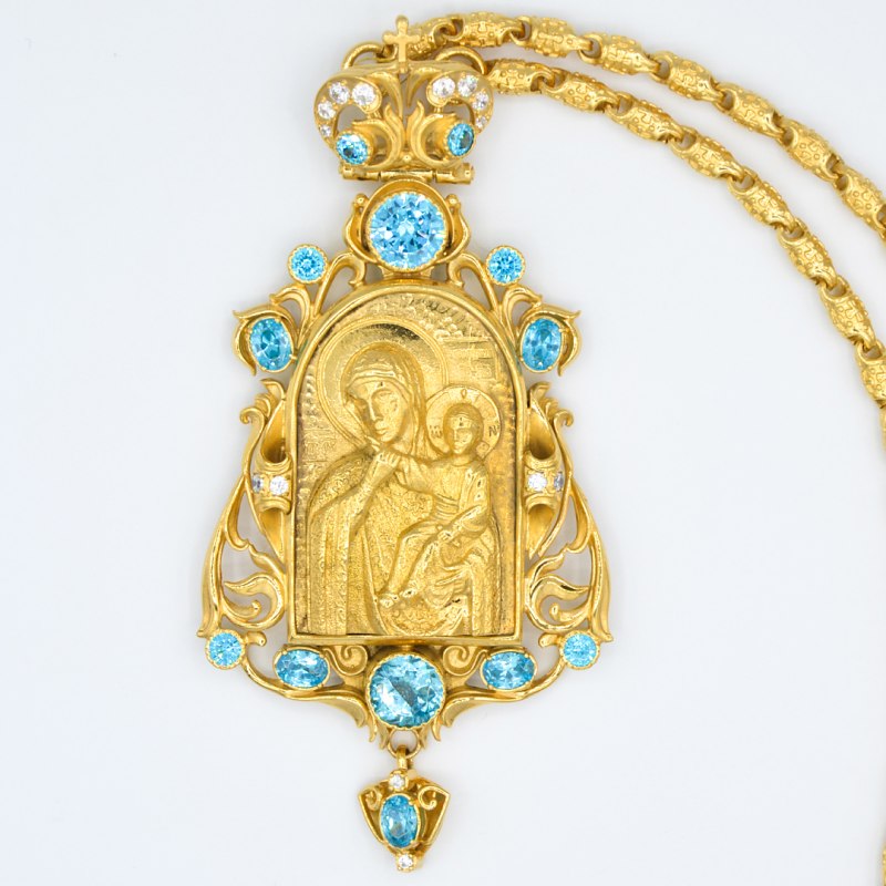 Архиерейская панагия с образом Богородицы Утешение и цепью. Панагия изготовлена из ювелирного сплава и покрыта качественной поЗолотой при помощи гальваники. Такое нанесение драгоценного металла очень надежное и долговечное, за ним просто ухаживать, оно не покрывается пятнами. Икона Богородицы литьевая и объемная. Лицевая часть панагии декорирована вставками камней-Фианитов. Панагия изготовлена при помощи исключительно ручного труда. Изделие продается в презентабельной подарочной упаковке с бархатным ложементом внутри.