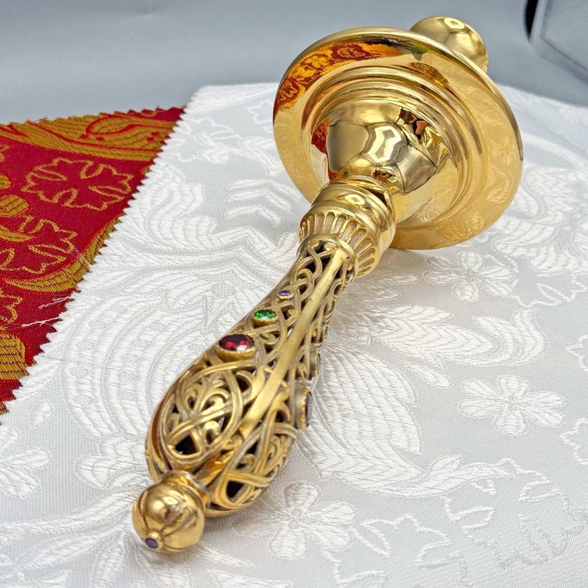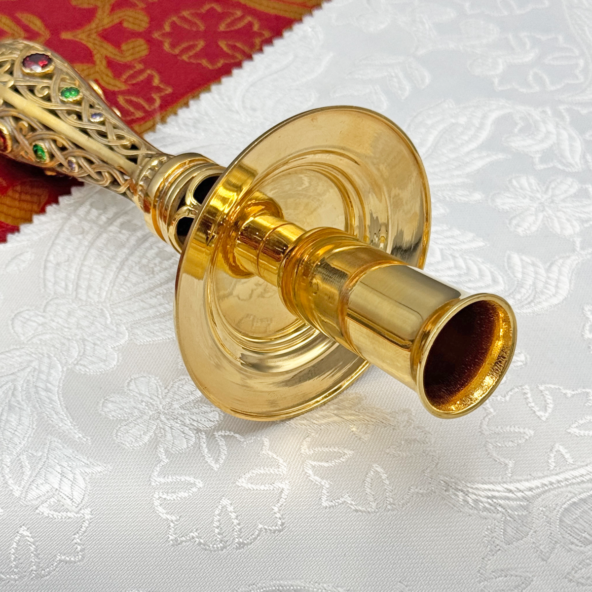 Ручной подсвечник из латуни с изящным филигранным узором и инкрустацией цветных камней. Этот изящный подсвечник предназначен для благоговейного служения и молитвенного уединения, является неотъемлемым атрибутом церковной утвари. Надёжный и удобный в использовании, он подчеркнёт торжественность каждого молитвенного момента, создавая атмосферу света и духовности.
