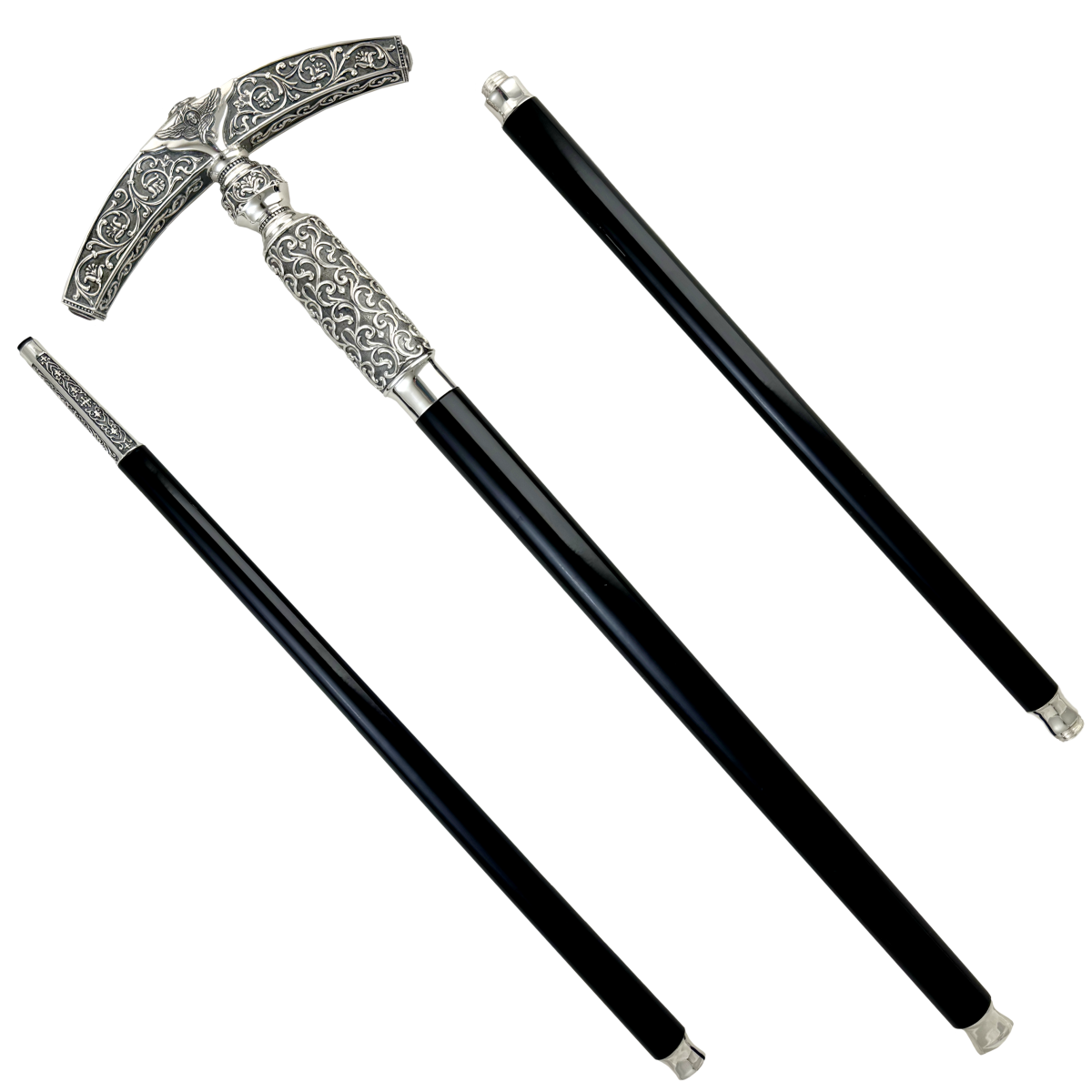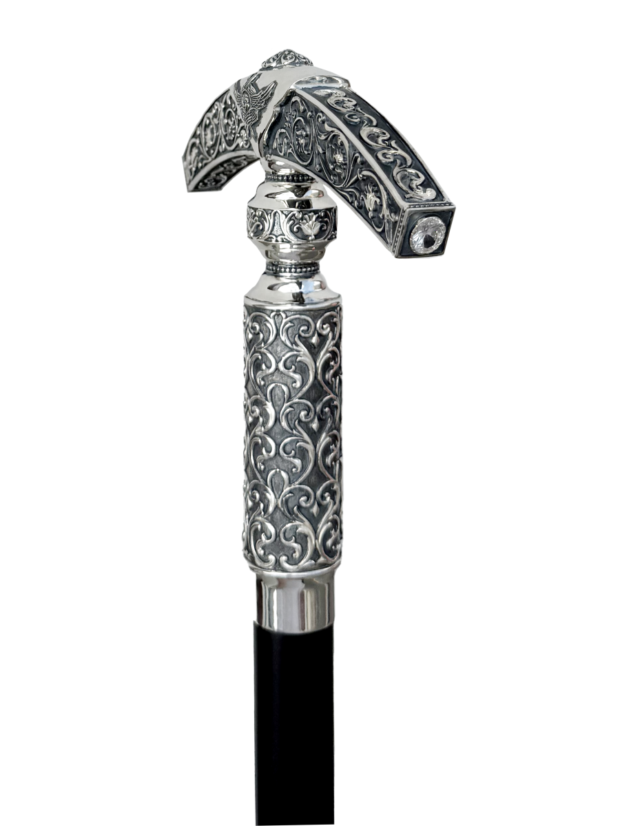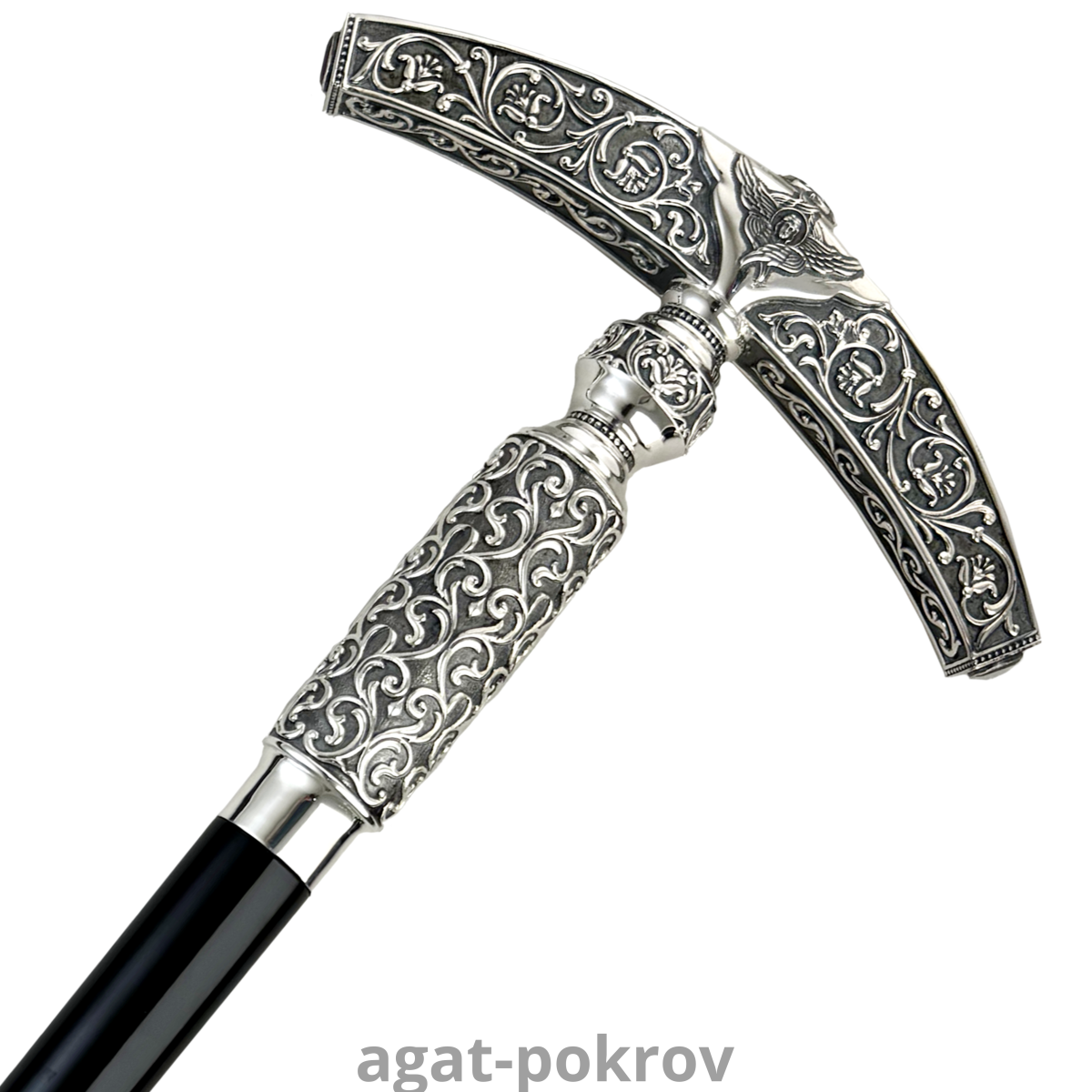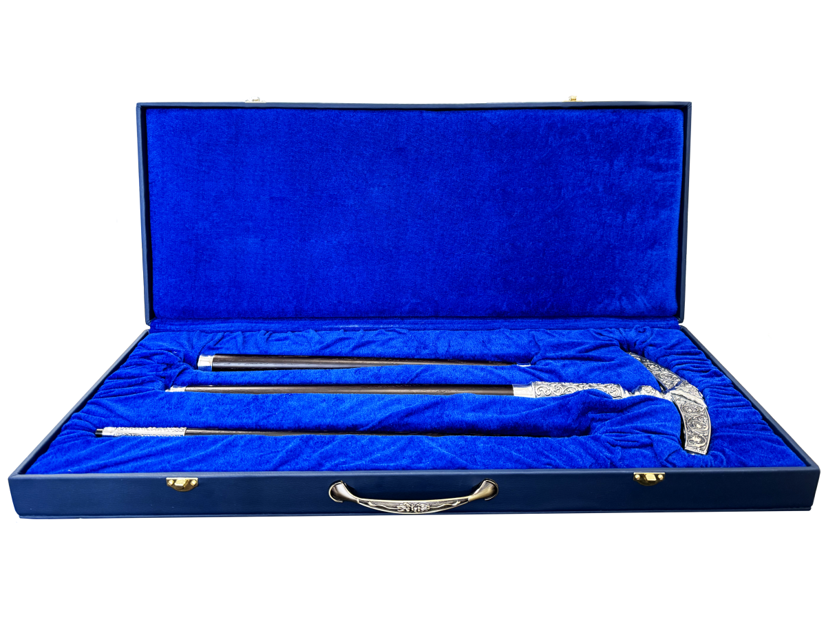 Навершие у посоха игуменского изготовлено из высококачественного ювелирного сплава, покрытого серебрением и украшено патинированием гальваническим методом, такое покрытие продлевает срок службы изделия и защищает от внешних неблагоприятных воздействий.Изделие украшено литьевыми орнаментами и камнями фианитами. Древко изготовлено из дерева. Посох продаётся в фирменной упаковке из экокожи с бархатным ложементом.