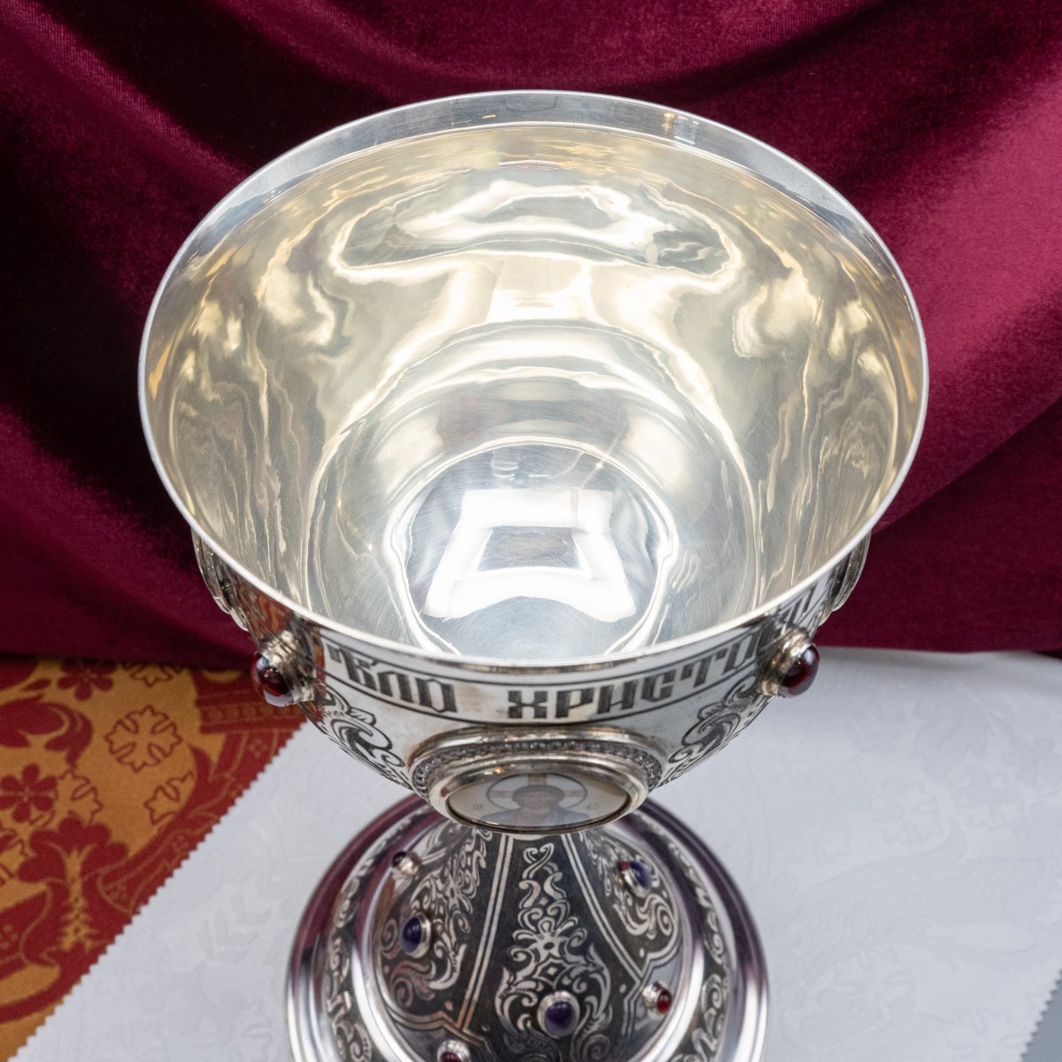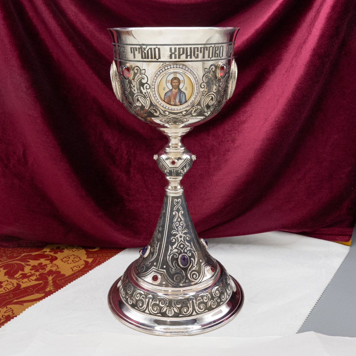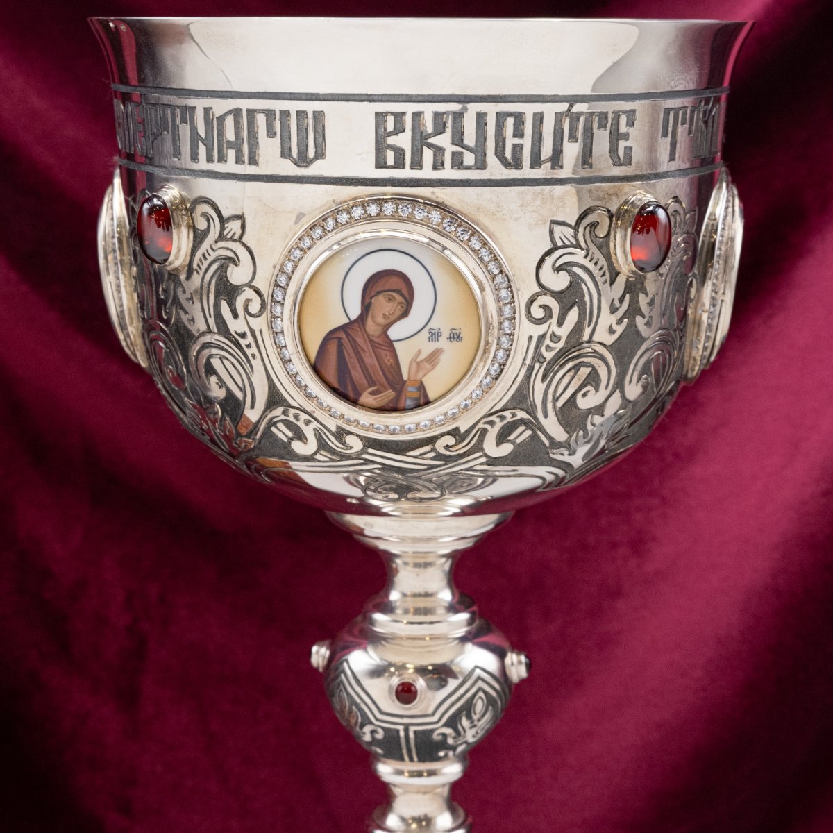 Потир объемом на 1,5л изготовлен в комбинированном варианте, чаша потира выполнена полностью из серебра, ножка потира - из ювелирного сплава, покрытого серебрением гальваническим методом. Такое покрытие продлевает срок службы изделия, защищает от внешних неблагоприятных воздействий. Потир декорирован вставками из фианитов. Изделие продается в фирменной упаковке из экокожи с бархатным ложементом.