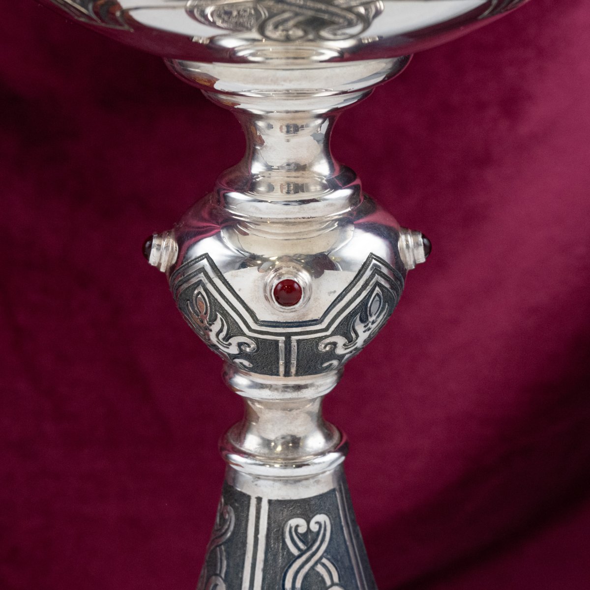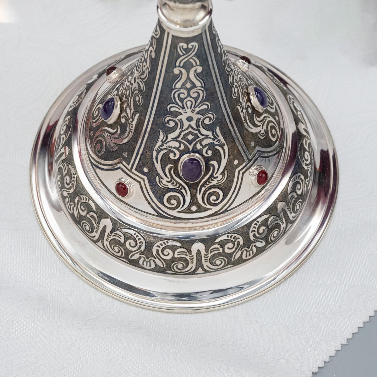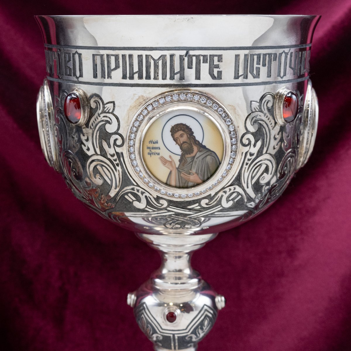 Потир объемом на 1,5л изготовлен в комбинированном варианте, чаша потира выполнена полностью из серебра, ножка потира - из ювелирного сплава, покрытого серебрением гальваническим методом. Такое покрытие продлевает срок службы изделия, защищает от внешних неблагоприятных воздействий. Потир декорирован вставками из фианитов. Изделие продается в фирменной упаковке из экокожи с бархатным ложементом.