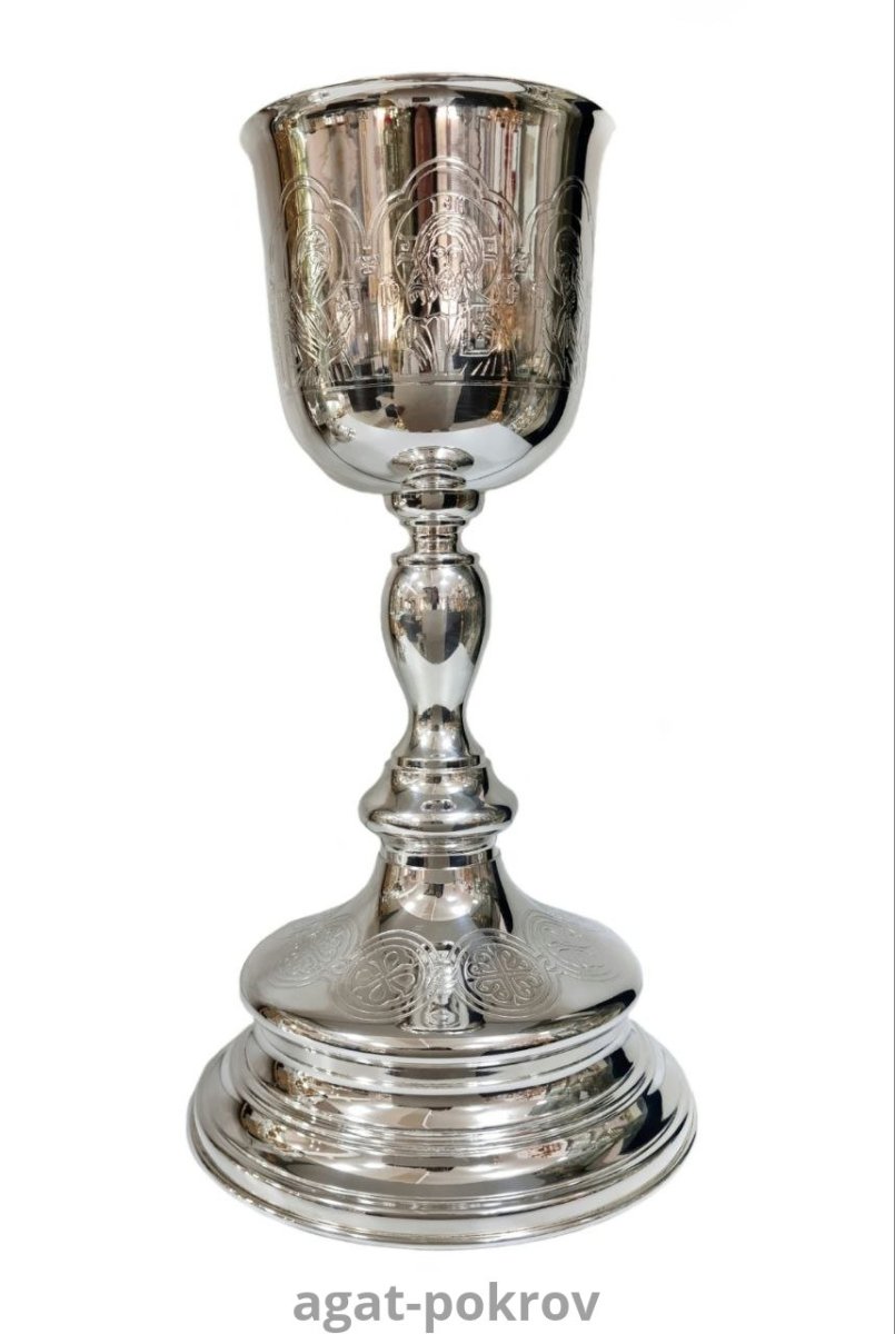 Потир изготовлен из высококачественного ювелирного сплава, покрытого серебрением гальваническим методом. Чаша потира изготовлена из мельхиора, покрытого серебрением. Потир декорирован узорами. Продается в фирменной упаковке из экокожи с бархатным ложементом.