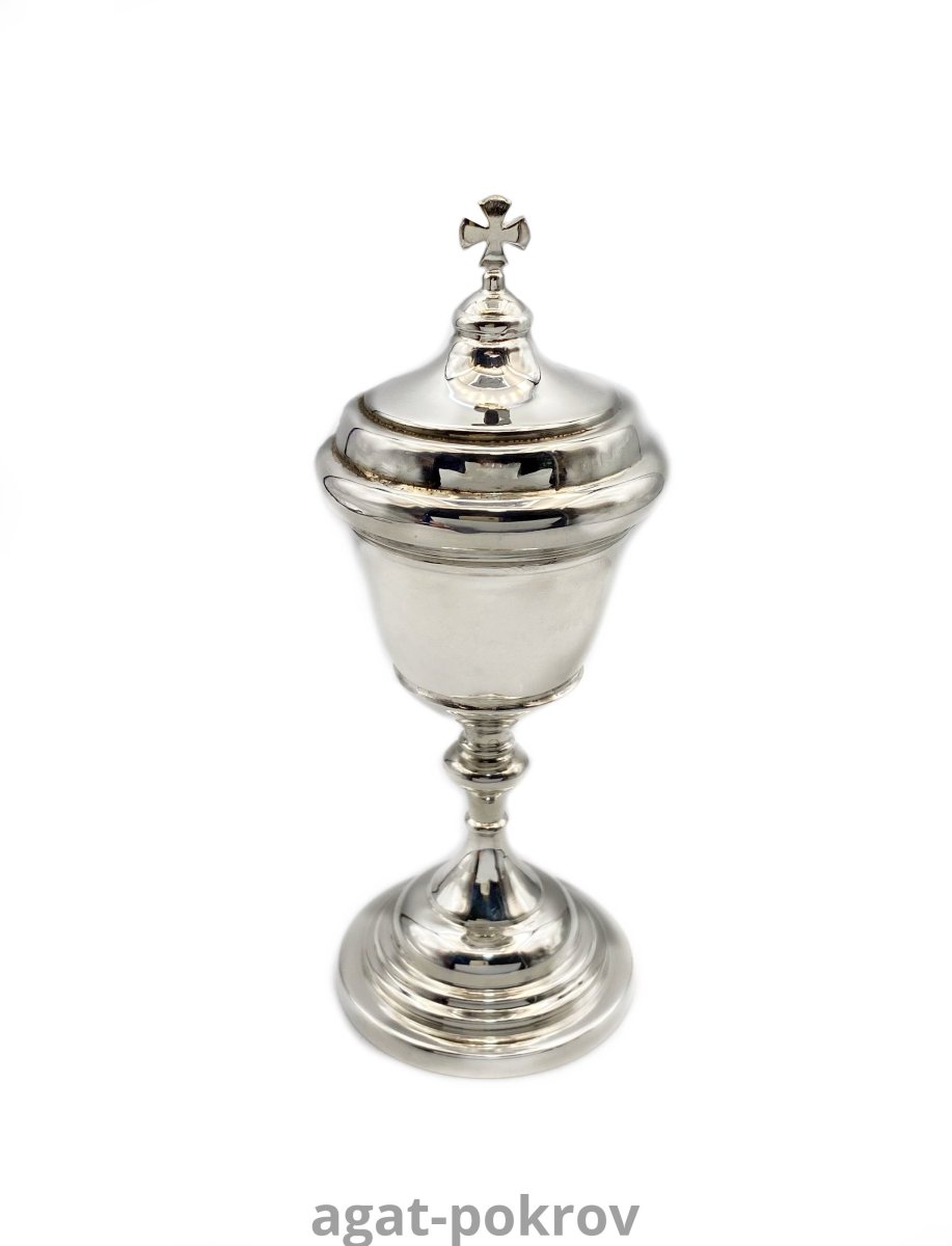 Потир изготовлен из высококачественного ювелирного сплава, покрытого серебрением гальваническим методом. Такое покрытие продлевает срок службы изделия, защищает от внешних неблагоприятных воздействий. Изделие продаётся в фирменной упаковке из экокожи с бархатным ложементом.