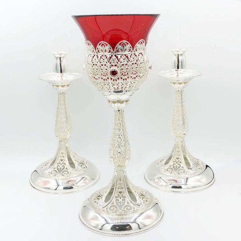 - Набор напрестольный - лампада и подсвечники латунные в серебрении 2.7.1275л-К